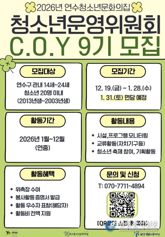 청소년운영위원회, 청소년봉사단은 내년 1월 28일까지, 청소년동아리는 3월까지 모집하며, 참여를 원하는 청소년은 연수청소년문화의집 누리집 또는 전화로 문의하면 된다.
