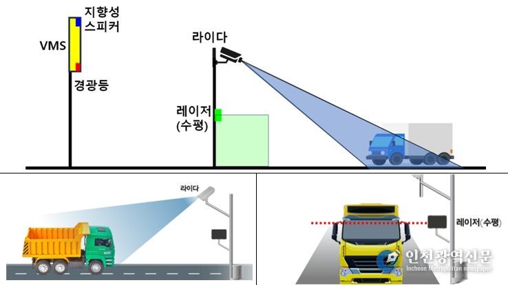 지하도로 전방 80~90m에서 라이다가 차량의 형상을 인식해 높이를 1차 판별하고, 전방 60~70m 지점에서 레이저가 수평 기준으로 높이 초과 여부를 다시 한번 정밀하게 확인한다. 차량에 불규칙한 적재물이 실린 경우에도 정확히 감지할 수 있어 오인식 가능성을 최소화했다.