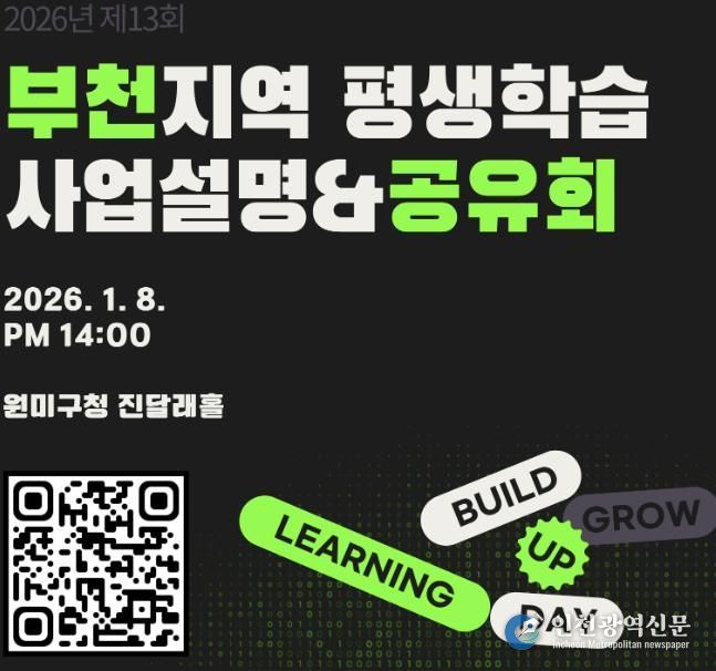 [인천광역신문] 박진 기자 | 부천시는 내년 1월 5일부터 시민 대상 평생학습 사업 공모를 진행하고, 이어 1월 8일에는 관련 설명회를 개최해 지역 기반 학습 생태계 강화에 나선다고 밝혔다.