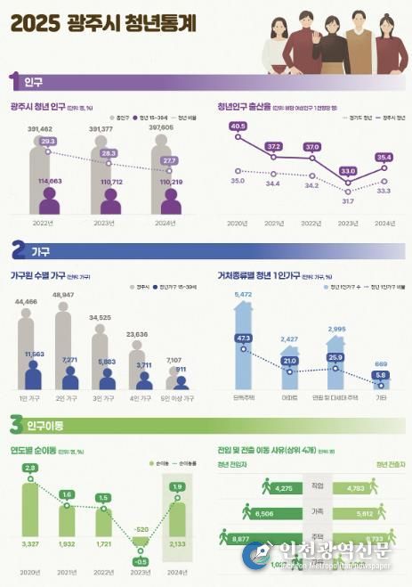 통계에 따르면 15~39세 청년인구는 11만 219명으로 전체 인구의 27.7%를 차지했다. 청년 가구는 2만 9천339가구로 이 중 1인 가구 비율이 39.4%로 가장 높았다. 청년인구 이동에서는 2천133명의 순유입이 발생해 순이동률은 1.9%를 기록했다.