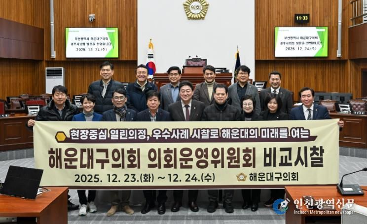 [인천광역신문] 박진 기자 | 해운대구의회 의회운영위원회는 지난 12월 23일부터 24일까지 1박 2일간의 일정으로 경주시 일원을 방문해 선진 의회 시설을 비교·분석하고 의정 역량 강화를 위한 벤치마킹을 실시했다.