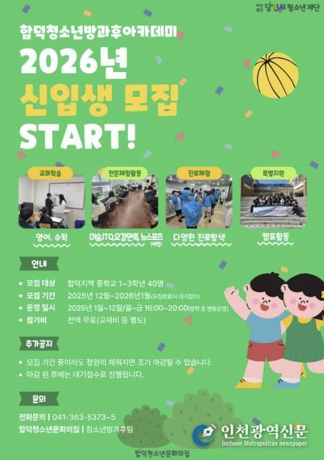 합덕청소년방과후아카데미 관계자는 “단순 돌봄을 넘어 청소년의 학습, 진로, 인성을 종합적으로 지원하는 질 높은 프로그램을 운영하겠다”며 “매년 조기 마감 사례가 있는 만큼 관심 있는 가정의 빠른 문의를 바란다”고 전했다.
