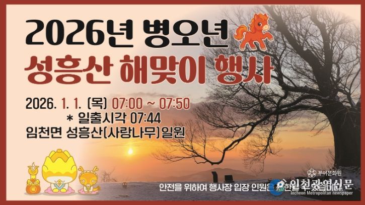 [인천광역신문] 박진 기자 | 부여군은 2026년 병오년 새해를 맞아 군민과 관광객이 함께 참여하는 ‘2026 병오년 성흥산 해맞이 행사’를 오는 1월 1일 성흥산(사랑나무) 일원에서 개최한다.