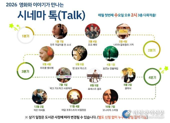 [인천광역신문] 박진 기자 | 천안시 신방도서관은 내년부터 영화와 이야기가 만나는 ‘시네마 톡(Talk)’ 프로그램을 운영한다고 30일 밝혔다.