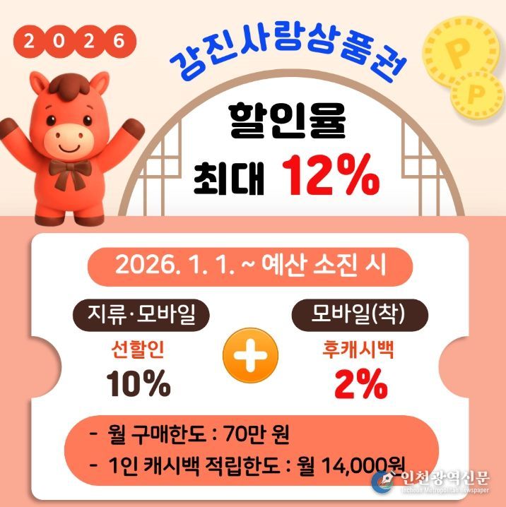 [인천광역신문] 박진 기자 | 강진군이 오는 2026년 적토마의 해를 맞아 지역경제 활성화와 군민 소비 부담 완화를 위해 지역사랑상품권 할인율을 상향 운영한다.