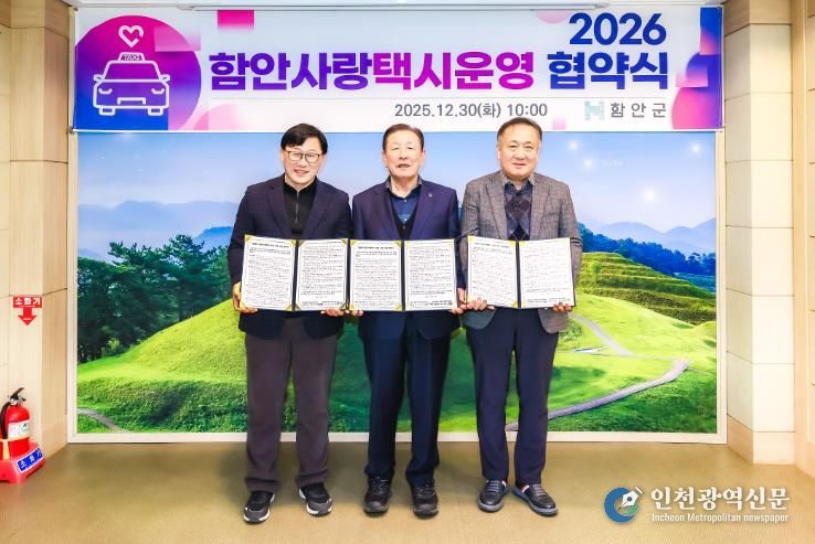 [인천광역신문] 박진 기자 | 함안군은 지난 30일 함안택시(유), (유)통일택시와 2026년 ‘함안사랑택시 운영지원사업’ 추진을 위한 협약식을 가졌다고 밝혔다.