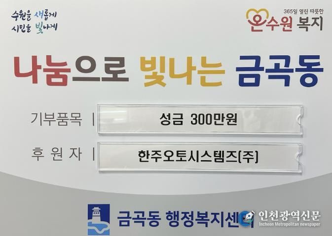 [인천광역신문] 박진 기자 | 지난 29일 수원시 권선구 금곡동 행정복지센터는 한주오토시스템즈(주)로부터 저소득 가정을 지원하기 위한 성금 300만 원을 전달받았다고 밝혔다.