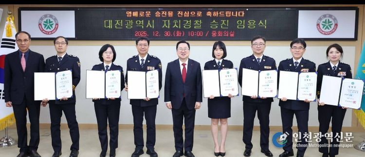[인천광역신문] 박진 기자 | 대전시 자치경찰위원회는 30일 대전시청 중회의실에서 이장우 대전시장과 박희용 자치경찰위원장, 동료 직원들이 참석한 가운데 자치경찰 승진 임용식을 개최했다.