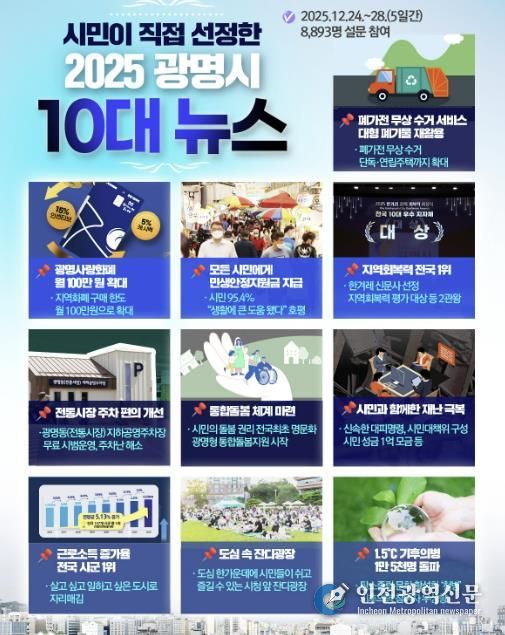 [인천광역신문] 박진 기자 | #광명시민이 직접 뽑은 2025년 10대 뉴스의 한 줄 평은 ‘위기 속에서도 흔들리지 않는 지속가능한 광명’이다. 고물가와 경기 둔화, 기후위기와 안전 불안이 이어진 한 해 속에서 광명시는 단기 성과보다 도시가 오래 버틸 수 있는 힘을 키우는 데 시정의 중심을 뒀다. 민생경제 대응부터 탄소중립, 돌봄·안전·공동체를 아우르는 구조적 변화까지 이어진 시정의 방향은 시민이 선정한 10대 뉴스에 고스란히 담겼다. 이는 2025년 광명시가 무엇에 집중했고, 어떤 기반을 다져왔는지를 분명히 보여준다.