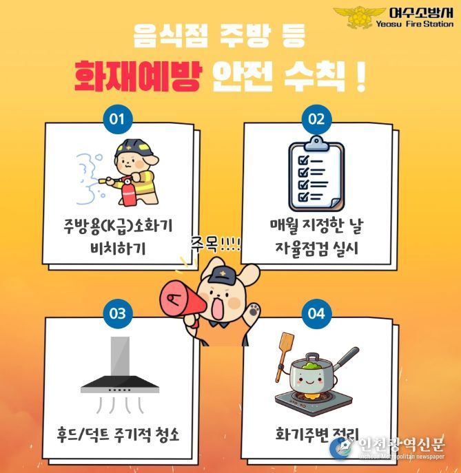 [인천광역신문] 박진 기자 | 여수소방서는 음식점 주방 등에서 발생하는 화재를 예방하기 위해 주방화재 예방 안전수칙 준수를 시민과 영업주에게 당부했다.