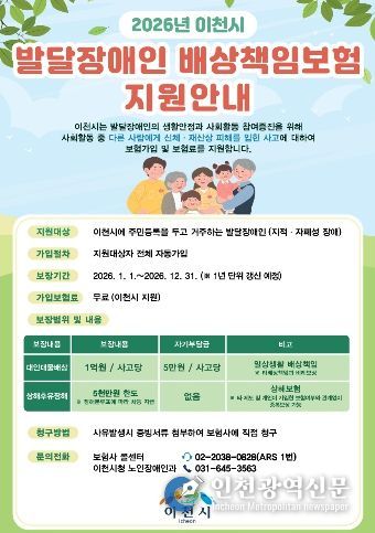 [인천광역신문] 박진 기자 | 이천시는 2026년 1월 1일부터 경기도 최초로 발달장애인을 위한 배상책임보험 가입 지원을 시행한다고 밝혔다.