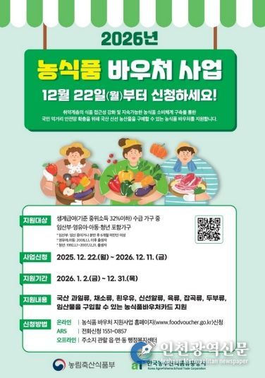 [인천광역신문] 박진 기자 | 충북도는 저소득층의 영양 불균형을 해소를 위해 추진 중인 ‘농식품 바우처’ 사업을 2026년부터 청년 가구까지 대폭 확대할 예정이다.