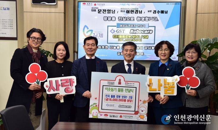[인천광역신문] 박진 기자 | 김제시는 GST 계열사 로보케어(대표 문전일)가 30일 탁상형 인지돌봄 로봇 ‘보미1’ 2대(약 1,600만 원 상당)를 기부했다고 밝혔다.