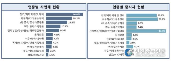 조사 결과, 아산시 제조업은 ‘전기/기타 기계 및 장비업’이 26.0%로 가장 높은 비중을 차지했다. 종사자 기준으로는 ‘전자부품/영상/음향/의료정밀광학업’이 27.4%로 가장 많았다.
