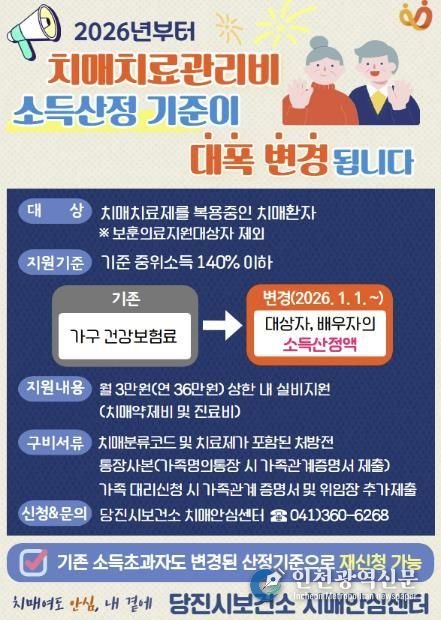 [인천광역신문] 박진 기자 | 당진시보건소 치매안심센터는 2026년 1월 1일부터 치매치료관리비 지원사업의 소득 기준 산정 방법이 변경된다고 31일 밝혔다.