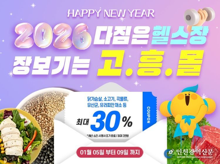 [인천광역신문] 박진 기자 | 고흥군이 운영하는 온라인 농수축특산물 쇼핑몰 고흥몰이 새해 다짐 시즌을 맞아 2026년 1월 5일부터 9일까지 5일간, 최대 30% 할인 혜택을 제공하는 특별 기획전 ‘다짐은 헬스장, 장보기는 고흥몰’을 진행한다.