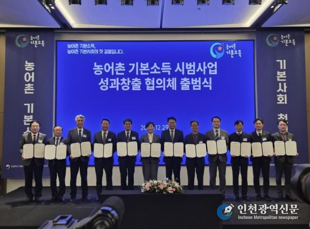 행사에서는 기본사회 강연을 시작으로 농어촌기본소득 시범사업 추진계획과 지역별 특화모델 운영 방향, 연구단 구성·운영 및 정책평가 계획이 공유됐다. 이어 농식품부–경인사연–10개 군이 참여하는 업무협약 체결과 협의체 출범 퍼포먼스, 기념촬영이 진행됐다.