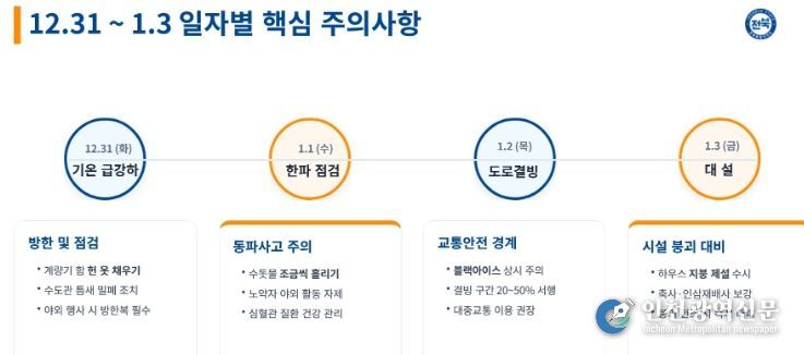 [인천광역신문] 박진 기자 | 전북자치도는 31일 해넘이와 1월 1일 해맞이를 앞두고 기온 급강하와 대설 가능성이 있는 가운데 도민과 방문객의 안전한 연말연시를 위해 현장 안전관리에 총력을 기울인다.
