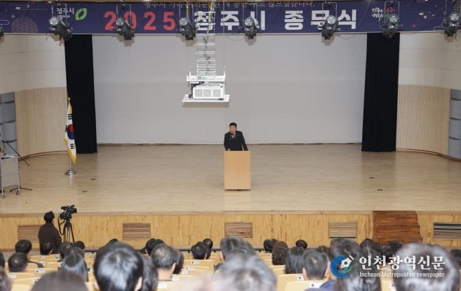 [인천광역신문] 박진 기자 | 청주시는 31일 문화제조창 5층 한국공예관 공연장에서 ‘2025년 종무식’을 개최했다. 행사에는 이범석 청주시장을 비롯한 시 공직자 300여명이 참석했다.