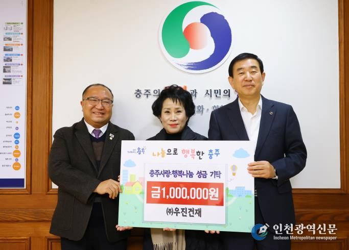 [인천광역신문] 박진 기자 | 충주시는 지역기업 우진건재가 시청을 방문해 어려운 이웃을 위한 ‘충주사랑행복나눔’ 기금 100만 원을 기탁했다고 2일 밝혔다.
