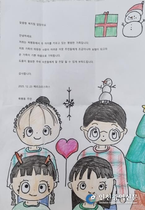 편지는 두 아이를 키우는 가정이라는 소개와 함께 도움이 필요한 이웃을 위하는 따뜻한 마음과 아이들이 직접 그린 눈사람, 선물 상자 등으로 꾸며져 따스함을 더했다.
