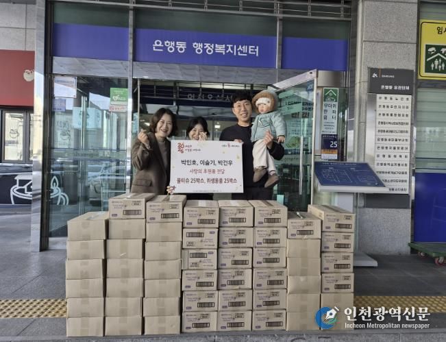 [인천광역신문] 박진 기자 | 시흥시 은행동 행정복지센터에 지난 12월 30일 한 부부가 세 살 자녀와 함께 방문해 관내 영유아와 청소년을 위한 물티슈 및 위생용품 50상자를 기탁했다.