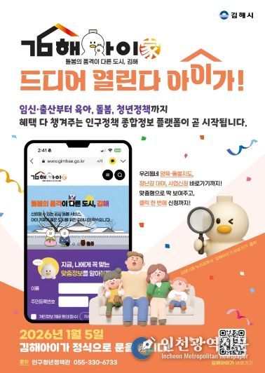 [인천광역신문] 박진 기자 | 김해시는 시민 누구나 임신부터 출산, 육아, 돌봄, 청소년, 청년 지원정책까지 한눈에 확인하고 신청할 수 있는 인구정책 종합정보 플랫폼‘김해아이가(家)’를 오는 5일 정식 오픈한다고 2일 밝혔다.
