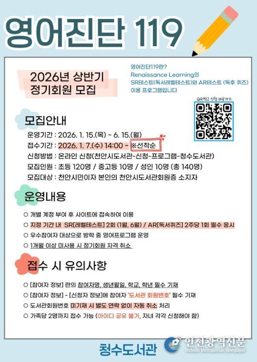 [인천광역신문] 박진 기자 | 천안시 청수도서관은 지난해에 이어 올해도 영어 학습 프로그램 ‘영어진단 119’를 운영한다고 2일 밝혔다.