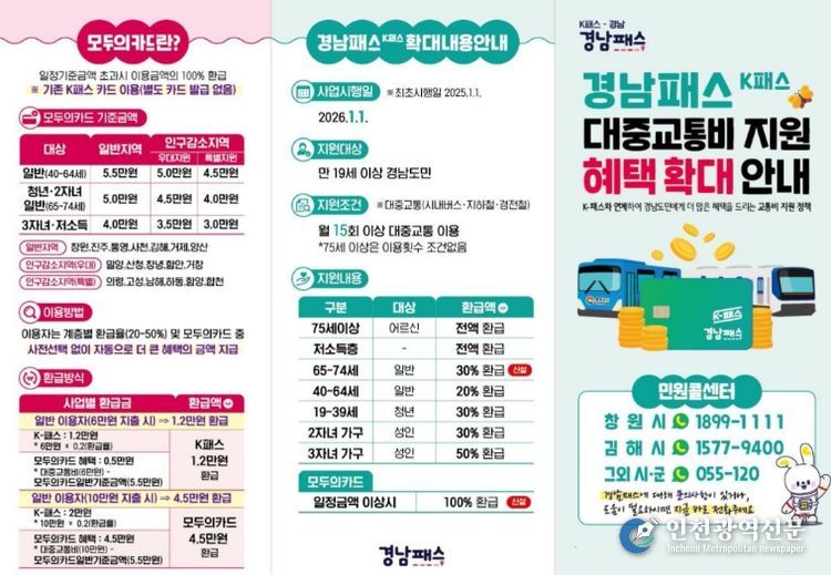 밀양시 관계자는 “2026년 경남패스 확대 시행으로 시민들의 교통비 부담이 실질적으로 완화될 것으로 기대된다”라며 “시민들이 제도를 정확히 이해하고 혜택을 놓치지 않도록 지속적인 안내와 홍보를 이어가겠다”라고 밝혔다.