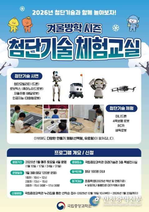 [인천광역신문] 박진 기자 | 과학기술정보통신부 국립중앙과학관은 겨울방학을 맞이하여 2026년 1월 중 매주 토요일 4일(10일, 17일, 24일, 31일) 동안'겨울방학 시즌 첨단기술 체험교실'을 국립중앙과학관 미래기술관 3층에서 운영한다고 밝혔다.