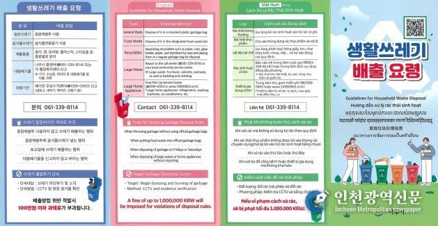 [인천광역신문] 박진 기자 | 외국인 거주자와 근로자가 생활폐기물 배출 방법을 쉽게 이해하고 올바르게 실천할 수 있도록 나주시가 다국어 홍보물을 제작해 무단투기 예방과 쾌적한 도시환경 조성에 나선다.