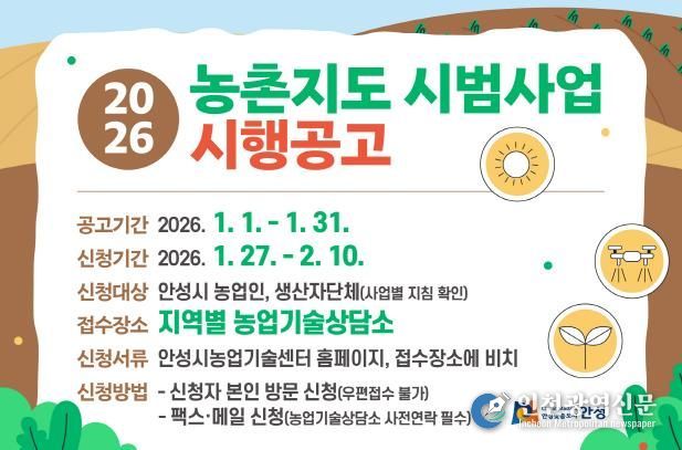 [인천광역신문] 박진 기자 | 안성시농업기술센터는 1월 1일부터 2월 10일까지 ‘2026년도 농촌지도 시범사업’ 시행 공고에 따른 신청자를 모집한다.