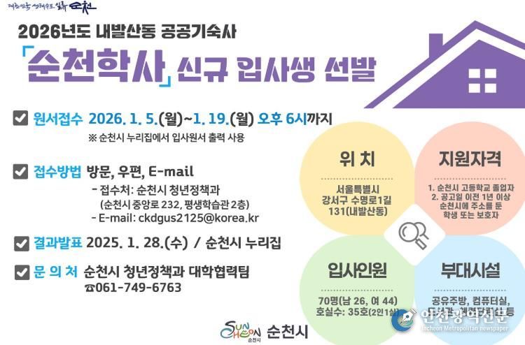 [인천광역신문] 박진 기자 | 순천시는 수도권 및 인근 지역 소재 대학교에 재학 중인 순천 출신 대학(원)생에게 안정적인 주거환경을 제공하기 위해 순천학사 신규 입사생을 오는 19일까지 모집한다.