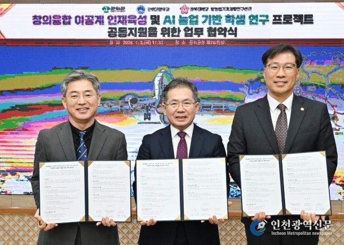 [인천광역신문] 박진 기자 | 군위군이 1월 2일 군청 제2회의실에서 군위고등학교, 경북대학교 밭농업기계개발연구센터와 함께 창의융합 이공계 인재 육성 및 AI 농업 기반 이공계 인재 육성을 위한 학생 연구 프로젝트 공동 지원 업무협약을 체결했다.