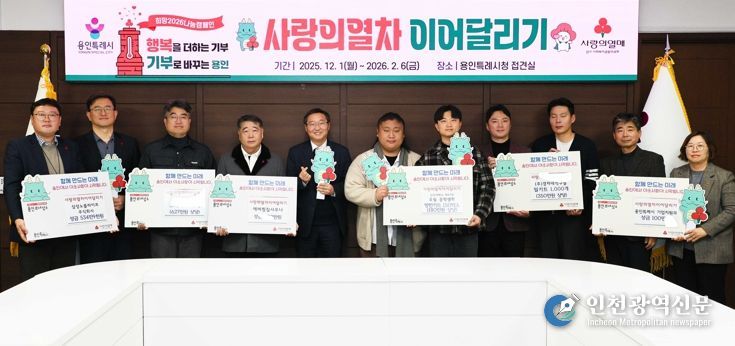 [인천광역신문] 박진 기자 | 2026년 붉은 말의 해, 용인특례시 사랑의 열차 이어달리기에 지역사회 따뜻한 나눔의 손길이 이어지고 있다. ‘사랑의 열차 이어달리기’는 용인의 대표 연말연시 이웃돕기 운동이다. 시는 지난해 12월 3일 시청 컨벤션홀에서 ‘희망 2026나눔캠페인 사랑의 온도탑제막식 및 사랑의 열차 이어달리기 발대식’을 열었다. ‘사랑의 열차 이어달리기’는 2월 6일까지 총 68일 동안 이웃돕기 성금 14억 원 모금을 목표로 이뤄진다.