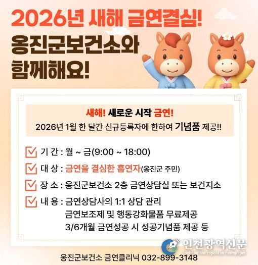 [인천광역신문] 박진 기자 | 옹진군은 2026년 새해를 맞아 군민의 건강증진과 금연 실천을 지원하기 위해 금연클리닉을 본격 운영하고, 1월 신규 등록자를 대상으로 등록기념품을 제공하는 선착순 이벤트를 실시한다고 밝혔다.