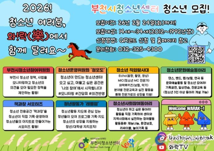 [인천광역신문] 박진 기자 | 부천여성청소년재단이 운영하는 부천시청소년센터는 2026년 청소년 참여자치조직 및 동아리 활동에 참여할 청소년·청년을 모집한다. 부천시청소년센터는 청소년의 자치 역량 강화와 주도적 참여 확대를 위해 참여, 문화예술, 진로직업탐색 등 다양한 활동을 운영하고 있다.