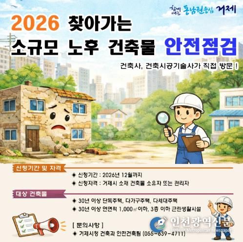[인천광역신문] 박진 기자 | 거제시는 사용승인 후 30년 이상 경과한 단독주택, 다가구주택, 다세대주택 및 3층 이하 연면적 1,000㎡ 이하의 근린생활시설 건축물을 대상으로 찾아가는 소규모 노후 건축물 안전점검 지원 사업을 올해도 계속 추진한다고 밝혔다.