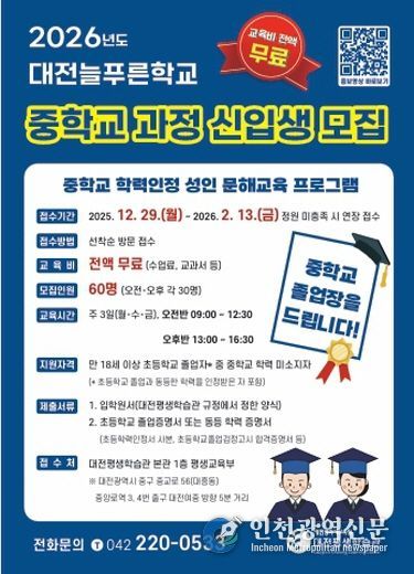 [인천광역신문] 박진 기자 | 대전평생학습관은 2026년 2월 13일까지 2026년 대전늘푸른학교 중학교 학력인정 과정 신입생을 모집한다고 밝혔다.
