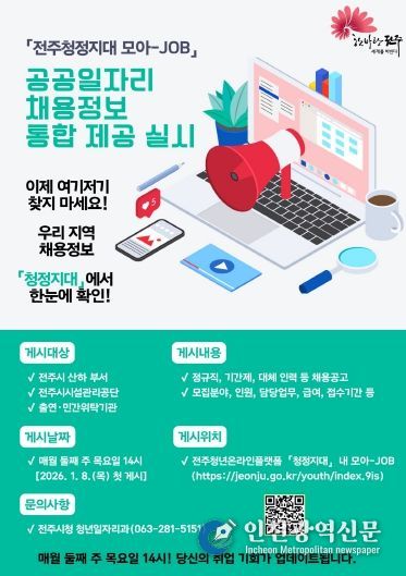 [인천광역신문] 박진 기자 | 전주시가 2026년 새해부터 청년 구직자의 편의를 위해 시청 및 산하 기관의 채용 정보를 한 번에 확인할 수 있는 전용 창구를 개설키로 했다.