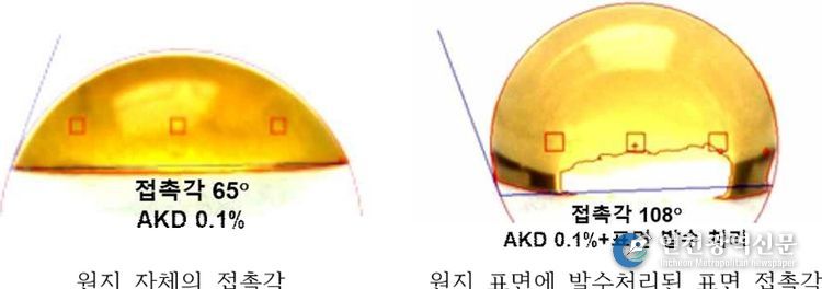 연구팀과 케이엔에스케미칼, 에스엘팩연구소가 공동 개발한 기술은 원지에 투입하는 AKD를 공정에 필요한 최소 수준으로 줄이는 대신, 종이 표면에 발수제를 단독 혹은 전분과 혼합해 도포하는 ‘표면 발수 처리(surface hydrophobization)’ 방식이다.