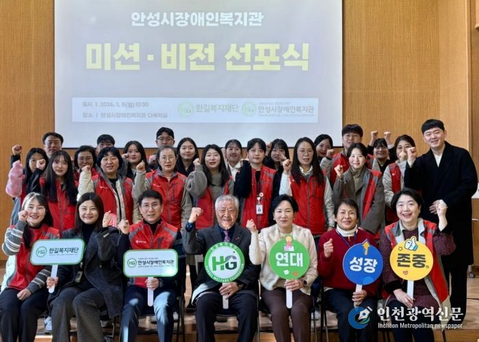 [인천광역신문] 박진 기자 | 사회복지법인 한길복지재단에서 수탁하고 있는 안성시장애인복지관은 지난 5일 직원과 복지관 이용자 대표 등이 참석한 가운데 향후 5개년(2026년~2030년)의 새로운 중장기계획을 발표하는 ‘미션·비전 선포식’을 개최했다.