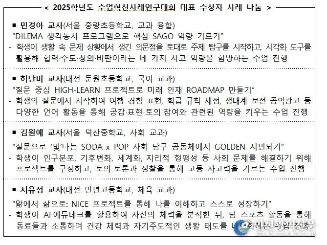 이번 시상식은 지속적인 연구로 수업 혁신을 이끌어 온 교사들의 노력을 알리고, 수업 경험을 공유하며 우수 수업사례를 전국적으로 홍보・확산하기 위해 마련됐다.