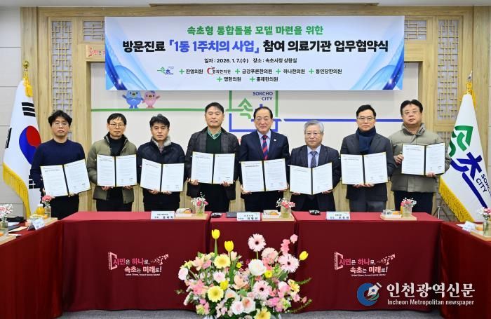 [인천광역신문] 박진 기자 | 속초시가 1월 7일, 시청 상황실에서 관내 7개 의료기관과 통합돌봄 방문진료 ‘1동 1주치의 사업’ 추진을 위한 업무협약을 체결하며 지역사회 기반 통합돌봄 체계 강화에 나섰다.