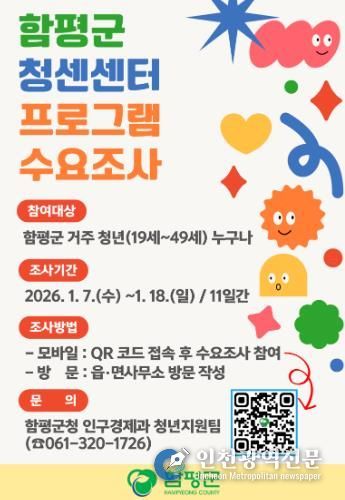 [인천광역신문] 박진 기자 | 전남 함평군이 청년들의 실질적인 수요를 반영한 청년센터 프로그램 운영을 위해 사전 수요조사에 나선다.