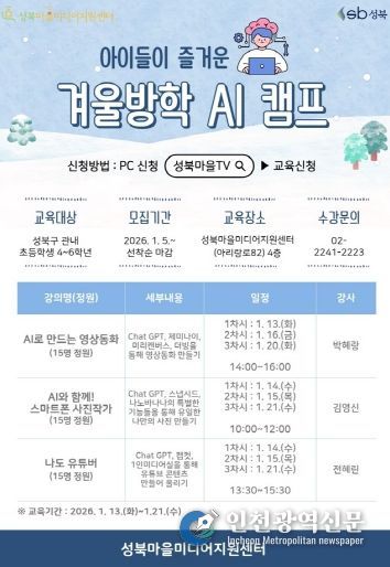 [인천광역신문] 박진 기자 | 서울 성북구 성북마을미 디어지원센터가 오는 13일부터 21일까지 미디어 체험 프로그램인 ‘겨울방학 AI 캠프’를 운영한다.