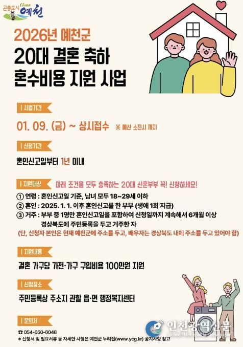 [인천광역신문] 박진 기자 | 예천군은 20대 신혼부부들을 위한 ‘결혼 축하 혼수비용 지원사업’을 올해도 추진한다.
