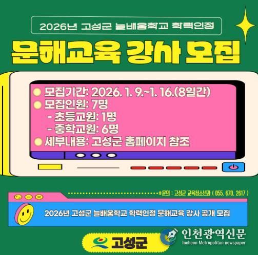 [인천광역신문] 박진 기자 | 고성군은 2026년 학력인정 문해교육 프로그램의 원활한 운영을 위하여 강사 7명을 공개 모집한다고 밝혔다.