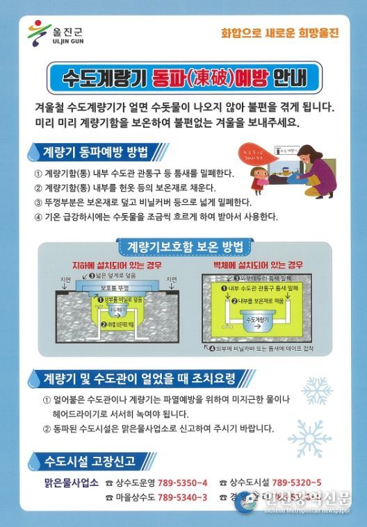 [인천광역신문] 박진 기자 | 울진군 맑은물사업소는 본격적인 동절기 한파에 대비해 수도계량기 및 수도관 동파로 인한 주민 불편을 최소화하고자 대대적인 예방 홍보와 긴급 복구 대책 추진에 나섰다.