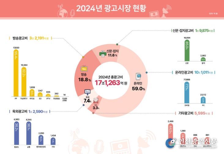 2024년 매체별로 보면 방송 광고비가 3조 2,191억 원으로 전체 광고비의 18.8%를 차지하고 있으며, 온라인 광고비 10조 1,011억 원으로 59.0%, 신문·잡지 광고가 1조 9,875억 원으로 11.6%, 옥외 광고는 1조 2,591억 원으로 7.4%로 집계됐다.